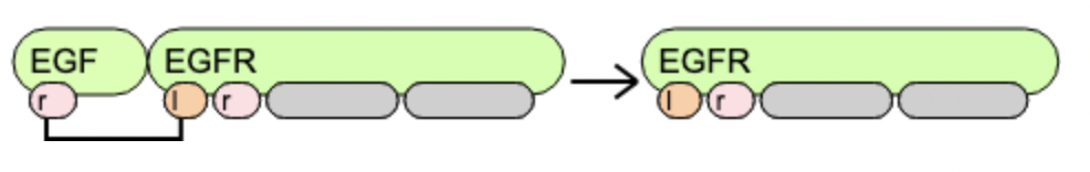pro_EGF() -> EGF() EGF().EGFR() -> EGFR() EGF(r!1).EGFR(l!1,r) -> EGFR(l,r) |